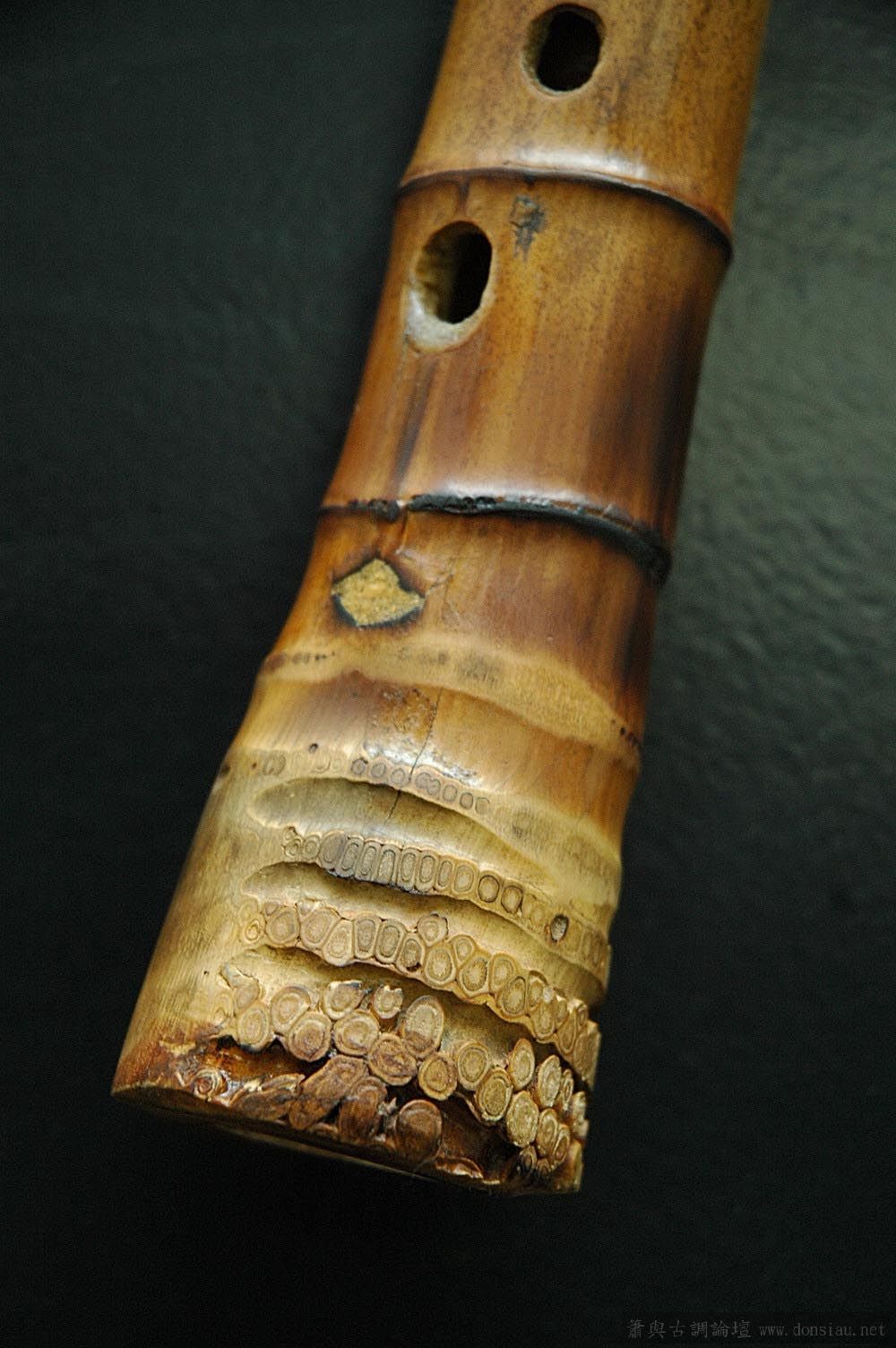 连续数天大手术以后,每个孔被弄得歪歪斜斜,但音准略有改善,现在每个约差10多、20音分,准备在一段时间箫稳定后再调整。近距离看修补痕迹,可以想象过程之狼狈