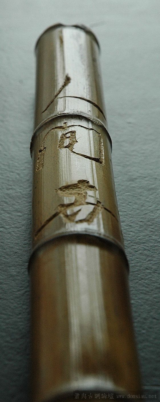所用箫材微弯,形态十分美观,原来长度足够作E调,可惜最上一节有两道穿透竹壁、长5、6厘米的裂缝,无可奈何之下,惟有把这节锯掉,转作F调。