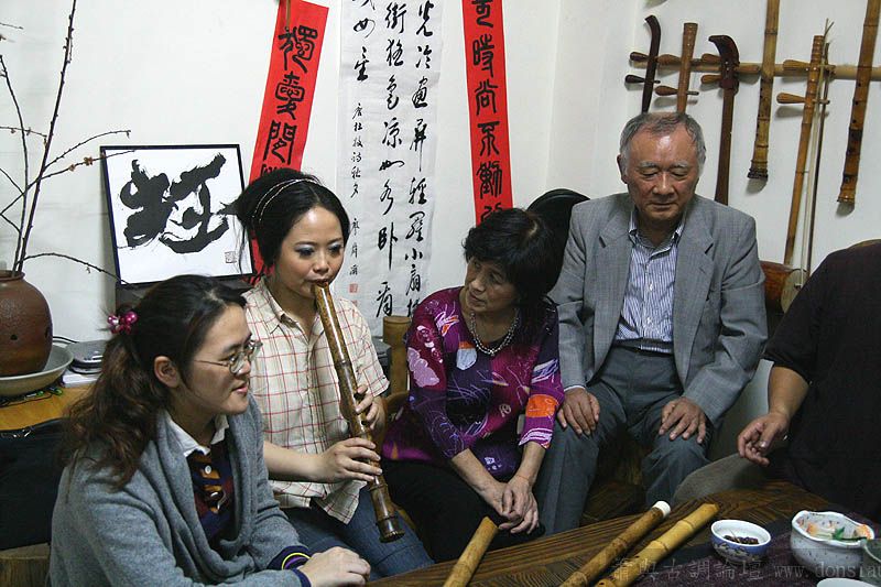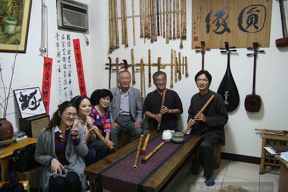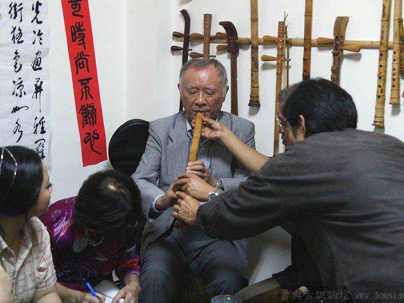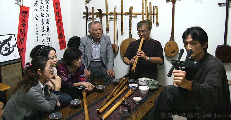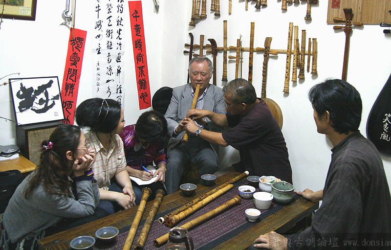日本尺八家宮田耕八朗老師及箏家渡边治子老師來台參加劉潁蓉【對穎成三竹-劉穎蓉與笛、簫、尺八的對話II】在國家演奏聽的演出,演出後陳中申老師邀請於無名子清粥小菜館聚會交流,相談甚歡,兩位老師對於簫與尺八差異很有興趣,對於音階、音色差異等交流了相當時間,興致極高,最後不顧夜深,再訪古調工作室,於是頂樓的工作室夜深中簫聲再起...