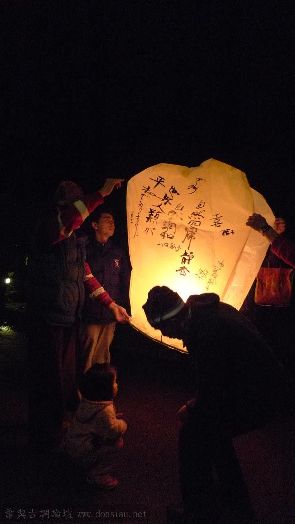 新田伉儷也吟唱回應家鄉民謠,其樂融融!臨別一起放天燈,寫上祈願.
