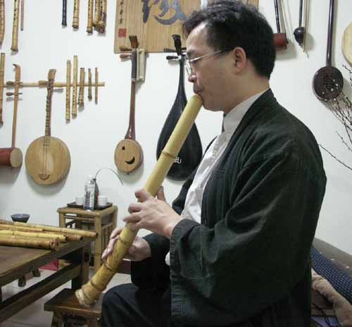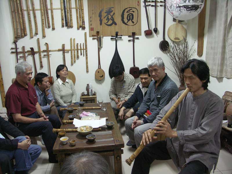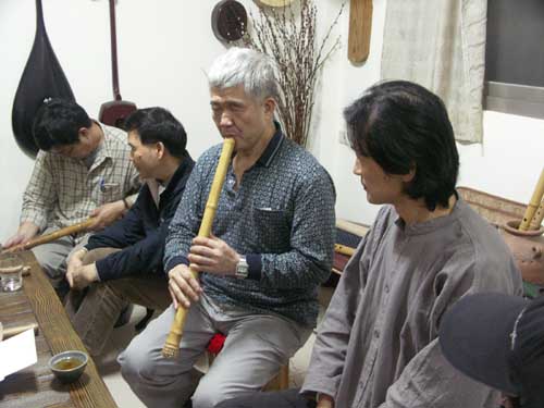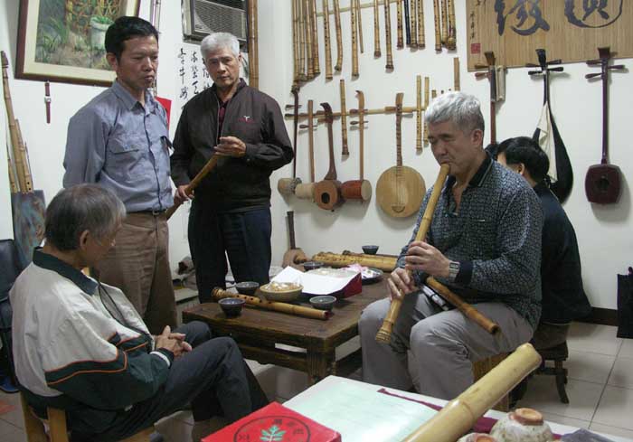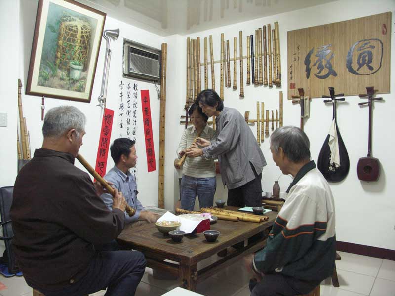 王先生帶領失明的吳先生與張先生也到達。張先生吹的是九孔簫與十孔簫,其樂天的心看在臉上!
