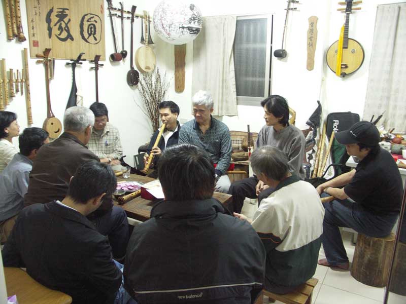 晚到的燈立兄正試吹錦德兄新作二尺管。
