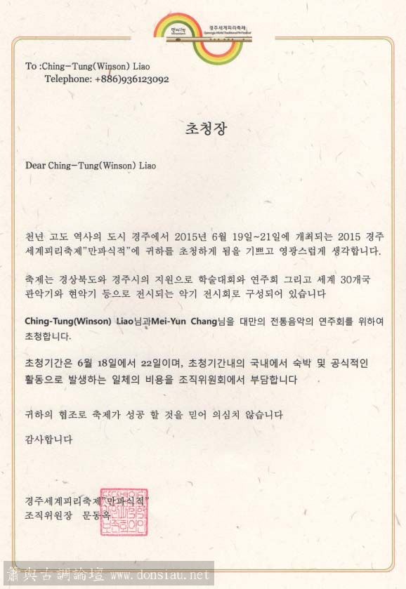 文松夫妻受邀將參與六月19-21在韓國慶州的傳統吹管樂噐節於其藝術中心演出