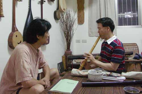 失明的吳木源先生週二晚間再來古調工作室,試吹我為他完成的十一孔唐口簫,