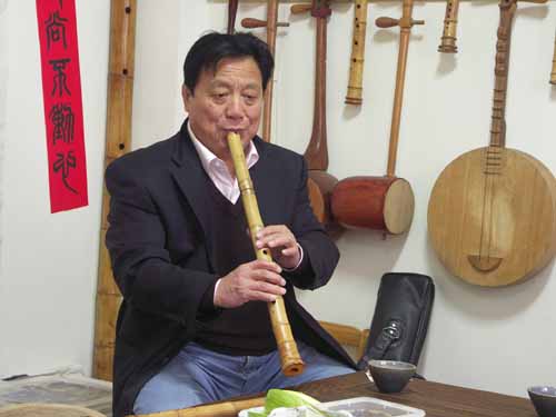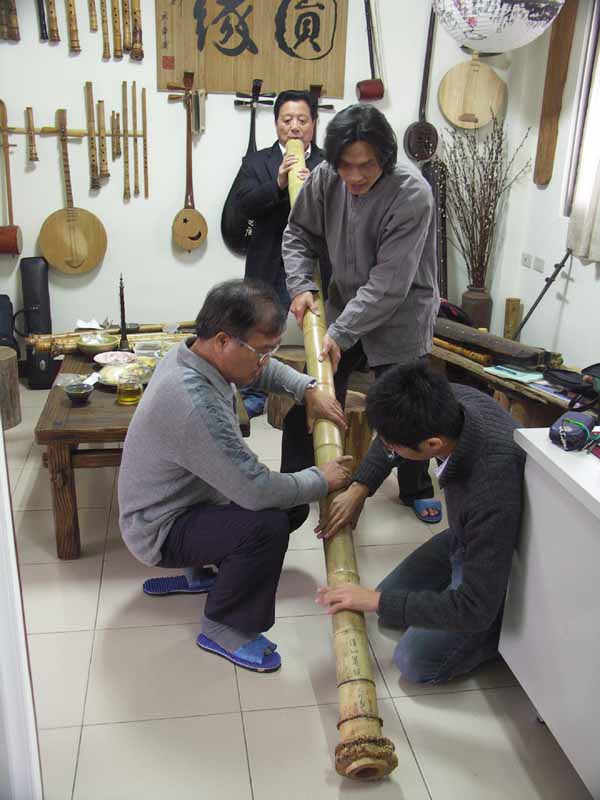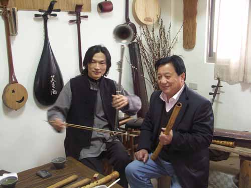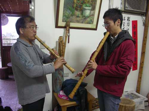吳老師精於嗩吶與竹笛,也深愛洞簫,藝術精湛,任教於音樂學院,交流間以竹笛吹一曲[百鳥吟]相當精采,也對文松手製應用中的南管噯很有興趣,當下試吹,合奏一曲梅花三弄,讚嘆第一次嘗試如此小音量嗩吶.也試玩長短各簫,對文松鼓勵有加,交流相當愉快,真是一見如故,好像熟悉已久的老朋友!