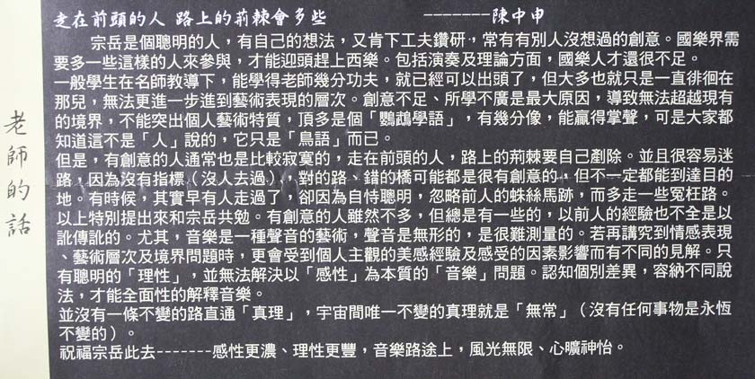 昨晚是劉宗岳同學的研究所畢業音樂會,傍晚陳中申老師來電提醒,我與內人乃驅車上陽明山文化大學,聆賞劉同學精采的竹笛獨奏;劉同學的畢業論文引用文松製簫多聲波共鳴理論,並使用文松調製的大笛演奏,是我參與音樂會並觀禮通過碩士畢業的頒證的意義,會後劉同學特別介紹與致謝.