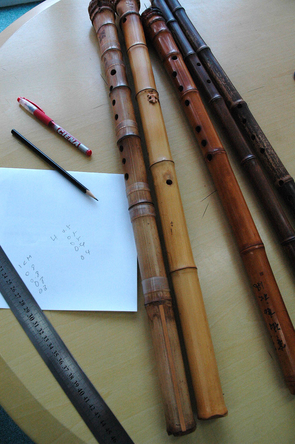 为 了 谨 慎 起 见 ,我 找 了 五 把 U 吹 口 的 F 箫 作 参 考 ,其 中 三 把 是 南 箫 、两 把 是 北 箫 ,它 们 分 别 由 上 海 、苏 州 、广 州 及 台 湾 的 五 位 名 家 制 作 (有 眼 力 的 乐 友 应 该 会 发 觉 ,颜 色 最 谈 的 那 把 是 文 松 老 师 的 作 品),这 也 可 说 是 我 多 年 来 寻 觅 好 箫 的 缩 影 !