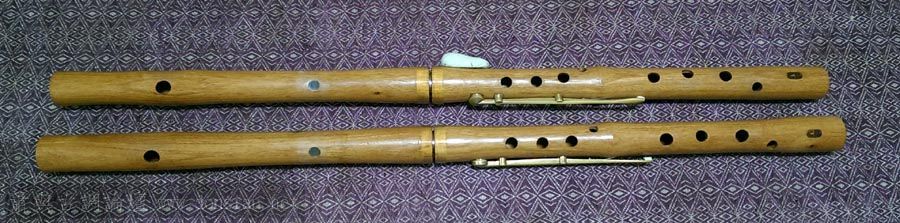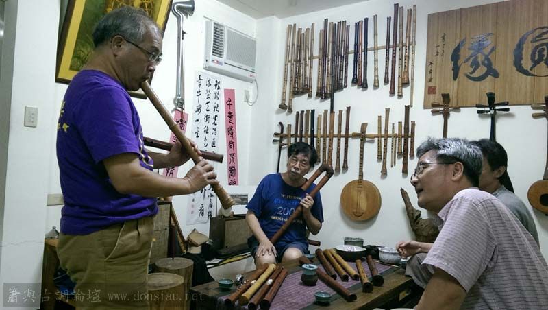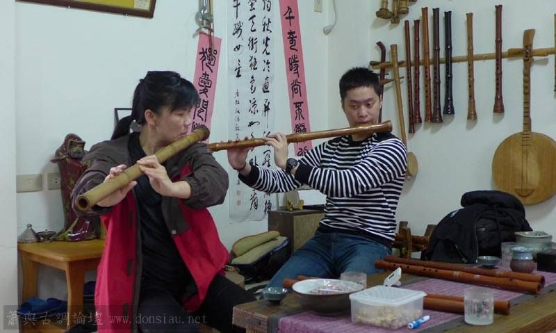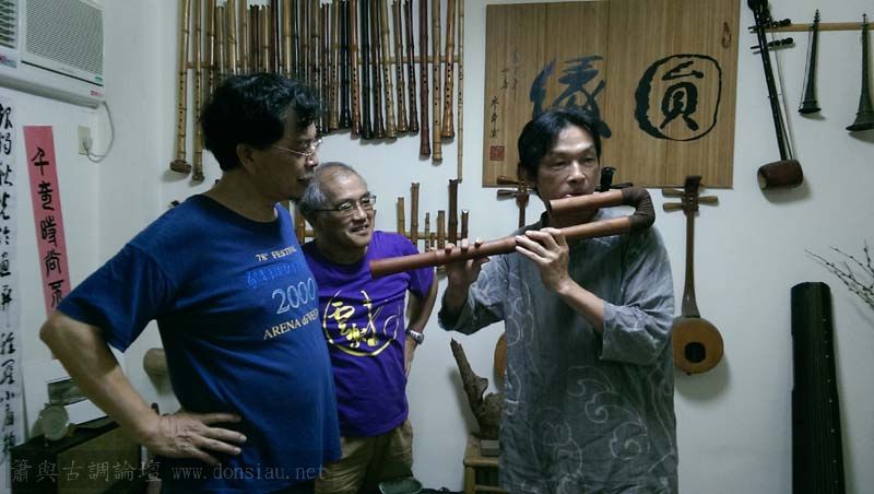 陳中申老師帶來長笛家莊清霖老師與科技人國樂愛好者許秀熒先生一起來交流,莊老師對長笛及低音長笛等很有研究,深入討論笛音色與製作上的問題,相談甚歡!莊老師相當肯定文松笛簫的製作與豐富共鳴音色,也對彎管低音笛的吹口設計很讚賞!理念殊途同歸,有樂遇知音之感!有意合作以竹炭材質製作中音笛吹口段,我樂意挑戰以吹口段調整全管音孔歸合共鳴深度的實驗