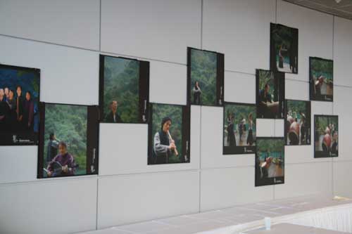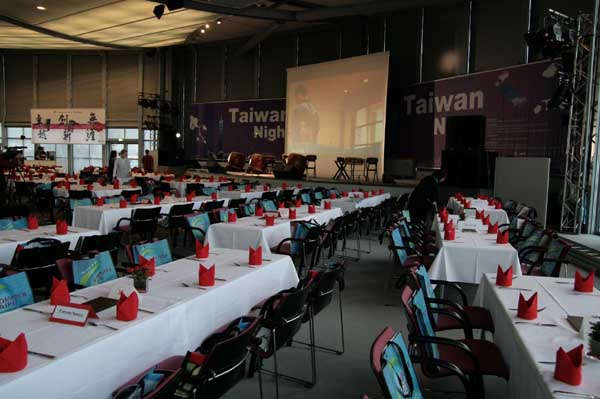 很大型場地,已經佈置了台灣的風景及廠商廣告,經協商我們所帶文宣品佈置於舞台正面牆上