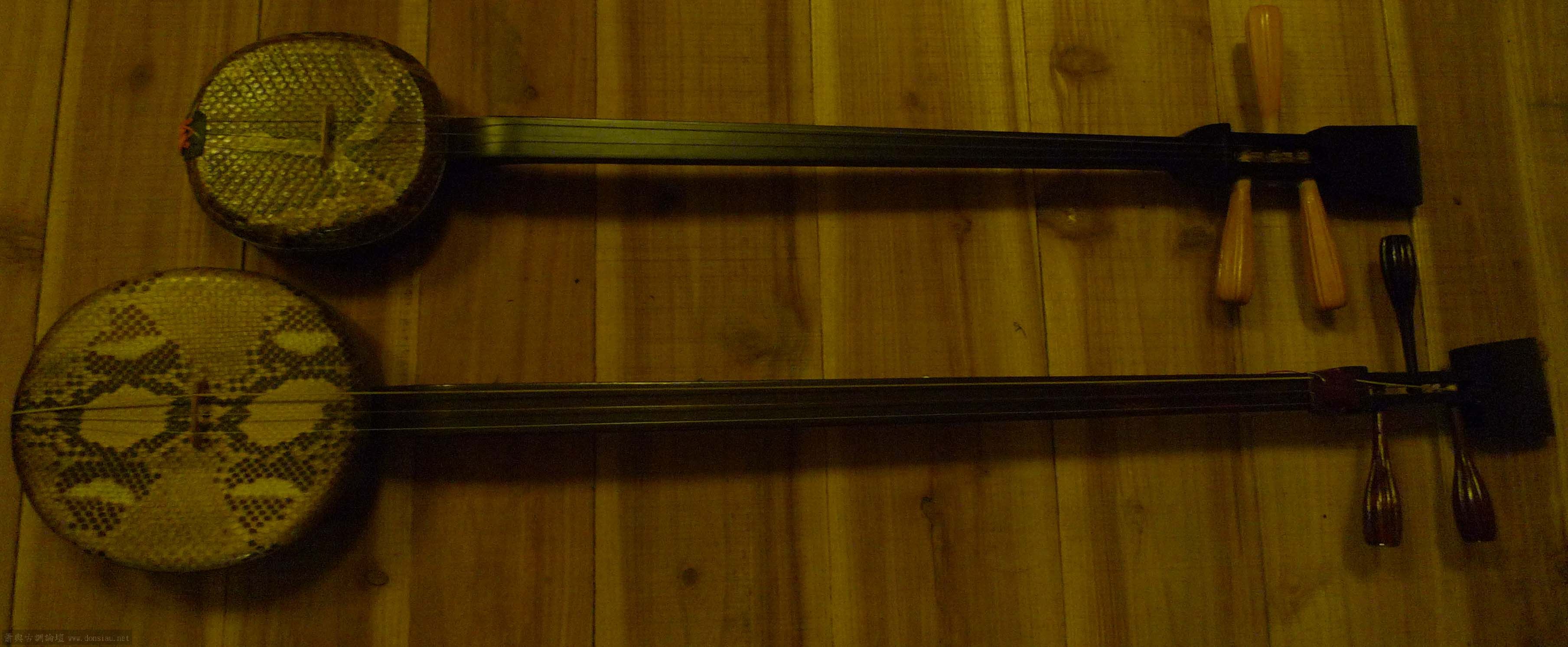 圖一下兩把桐面三弦是典型台灣戲曲或彈唱用三弦,大型方形是三重埔已故老藝人張先生所製,