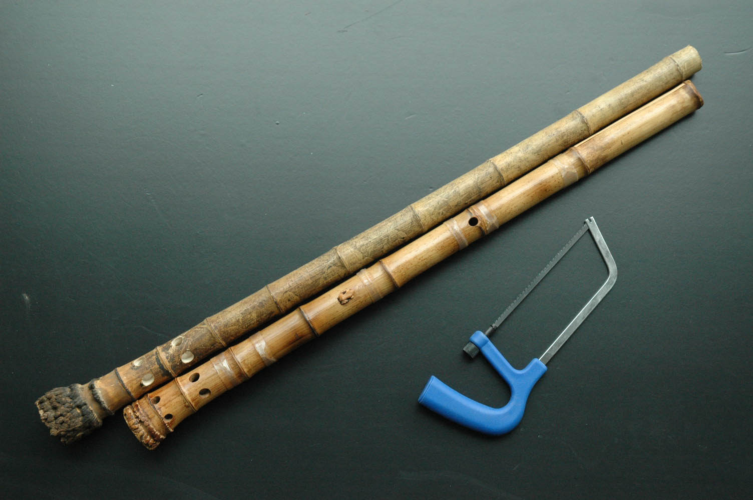 第 一 个 难 关 - 竹 材 来 源 是 在 上 周 五 解 决 ,我 不 辞 冒 昧 ,托 一 位 亦 师 亦友 的 制 笛 家 帮 忙 ,为 我 找 到 数 根 已 弄 直 、风 干 数 年 、并 已 通 节 的 毛竹。