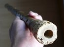 此管紫竹系今年清明期间在亲戚家采挖,由于春天万物复苏,紫竹也开始生长萌动,加之今年春上降雨较多,所以采挖时已吸收了大量水分。制作时虽未完全干好,但管身仍显轻薄。全管长53.5CM,吹口端内径1.8CM,管尾内径1.4CM。