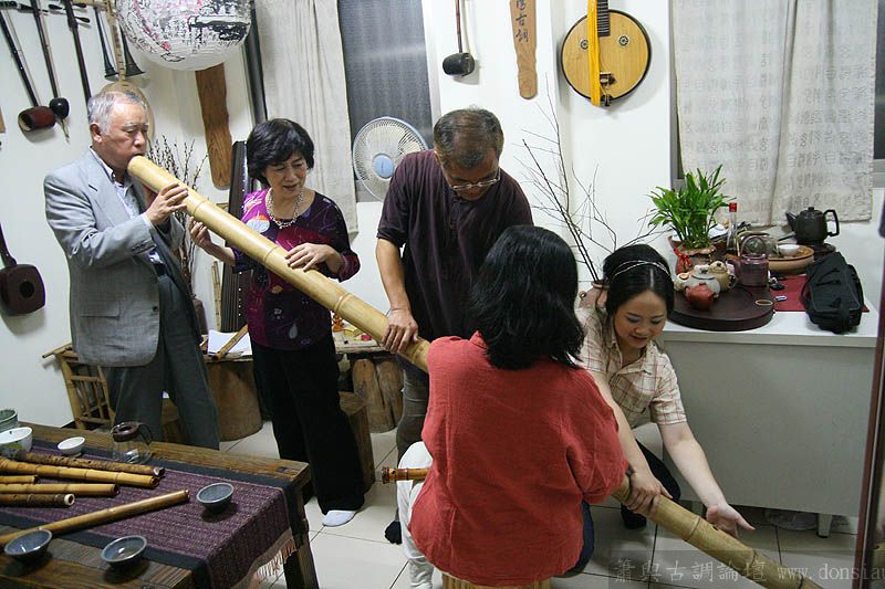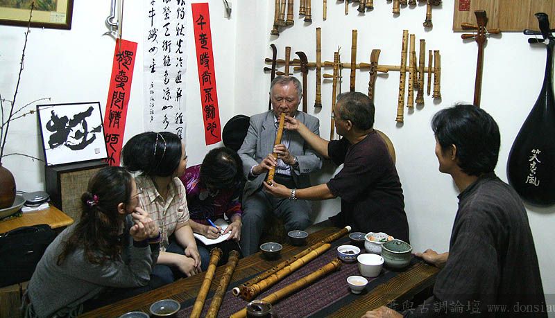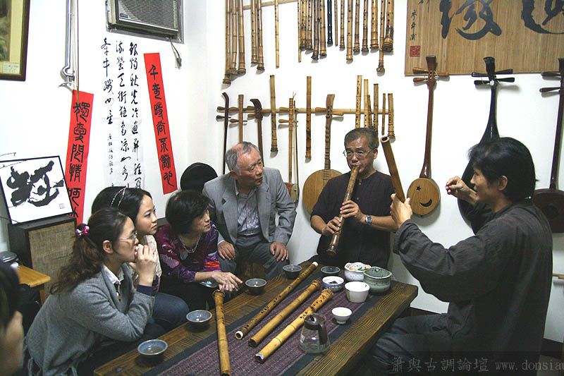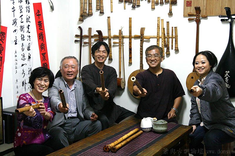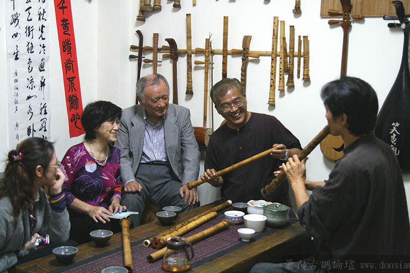 日本尺八家宮田耕八朗老師及箏家渡边治子老師來台參加劉潁蓉【對穎成三竹-劉穎蓉與笛、簫、尺八的對話II】在國家演奏聽的演出,演出後陳中申老師邀請於無名子清粥小菜館聚會交流,相談甚歡,兩位老師對於簫與尺八差異很有興趣,對於音階、音色差異等交流了相當時間,興致極高,最後不顧夜深,再訪古調工作室,於是頂樓的工作室夜深中簫聲再起...