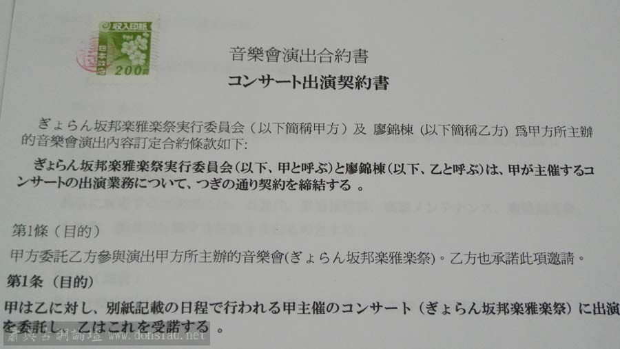 演出合約書已經寄到,簽約後寄還生效,共演出四場,含音樂廳、寺廟及學校,