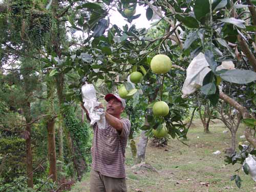 四結兄採一棵柚子贈送添丁兄,很特別的紅文旦,添丁兄仔細觸摸細緻的果實!