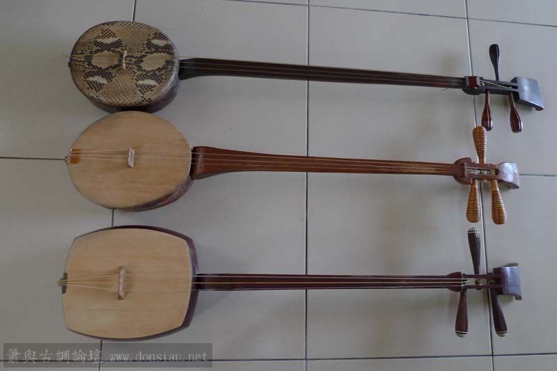 圖一下兩把桐面三弦是典型台灣戲曲或彈唱用三弦,大型方形是三重埔已故老藝人張先生所製,
