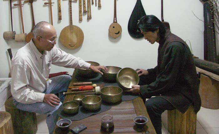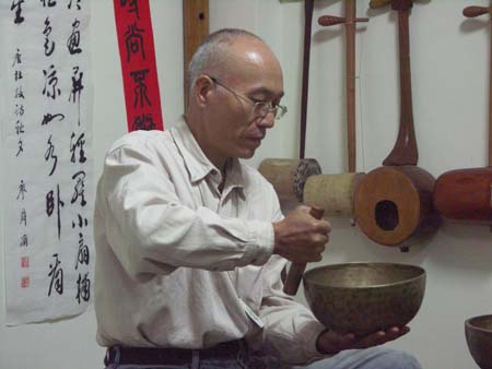 潘先生已修行多年,並在道場中分享修行經驗,唱缽是協助修行的功課之一,使用大小不同的七個缽,敲擊的棒槌也有三四種不同硬度,其敲擊效果有所差異,有時還用摩擦出聲方式,其音饒繞不絕,共震起來的缽聲有很特別聲響,有提有鬆的功效,隨著敲擊方式與高低音組合,可以讓心靈集中於當下。
