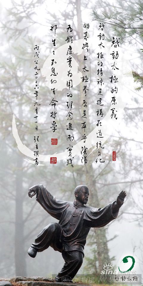 太極既啟,分派陰陽。剛柔虛實,步出健康。拳拳服膺,古道熱腸。大開大合,氣宇軒昂。 樂此極娛,莊敬日強。舞動韻律,地久天長。