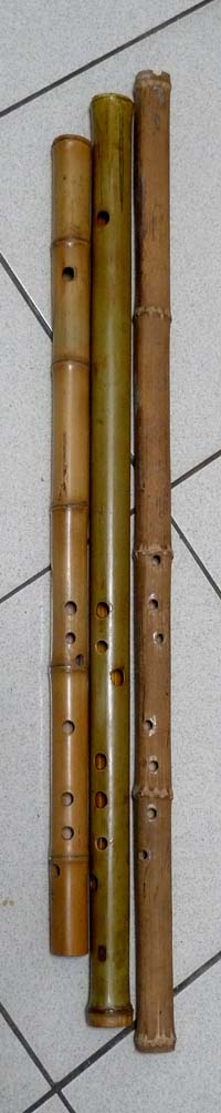 三支倒頭製作的笛簫,右起四方竹GC八孔簫、唐竹BE八孔笛、桂竹大G十孔笛