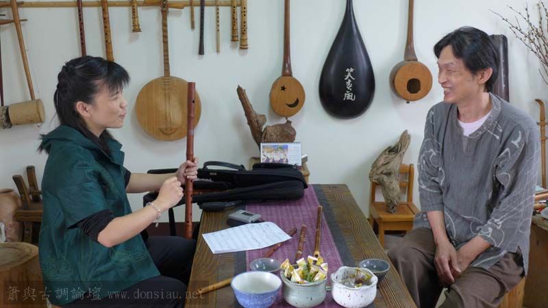 文大莊桂櫻老師與台藝大研究所丘同學到訪,討論十孔笛的排列順序,