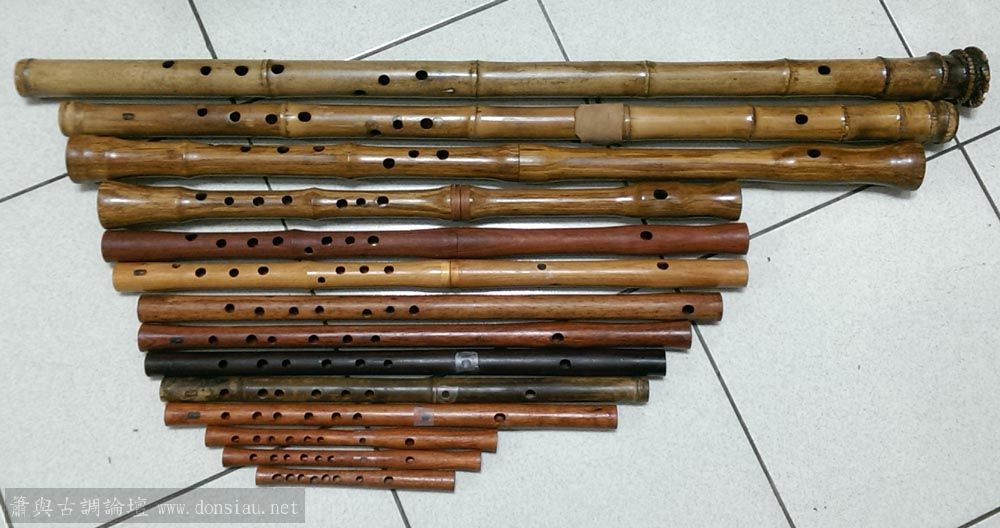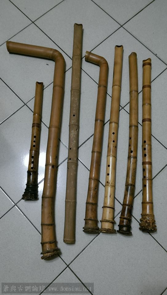 匯總歷年實驗製作可一人操控的低音管,左起比較尺八DG,倍DG彎管與直管,FBb彎管與直管,#FB管,GC管