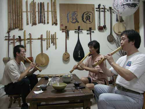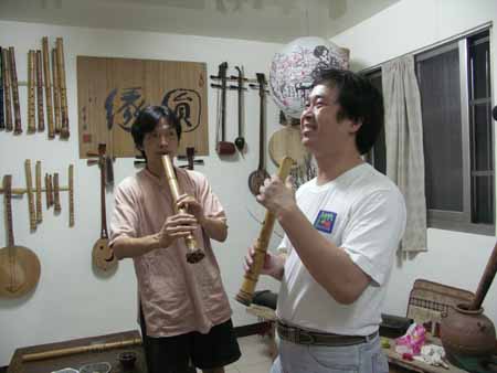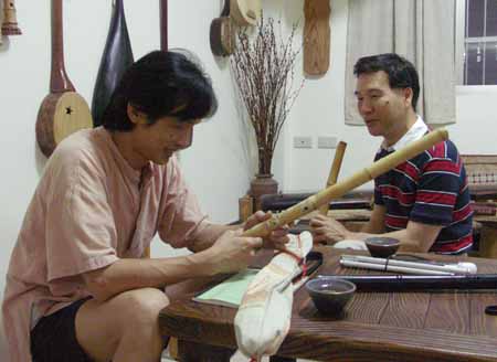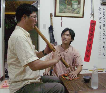 失明的吳木源先生週二晚間再來古調工作室,試吹我為他完成的十一孔唐口簫,