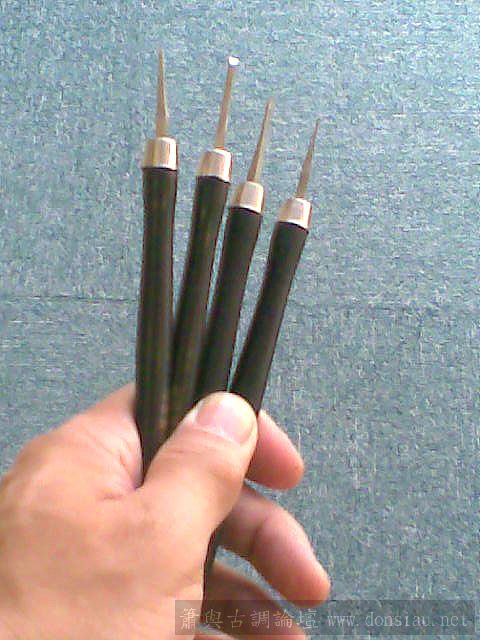 谢谢大家的鼓励! 回风笑箫兄,我所用的是从上海买来的一套白钢雕刻刀,一套12把,厂家声称适用于竹、木、石、玉与象牙雕刻,见图。
