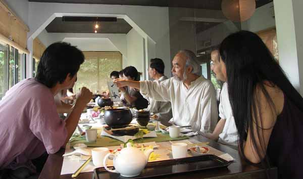 別墅是日式建築木屋,後院面對溪流,數棵百年老樟樹,潺潺溪流聲中與進發老師閒聊,