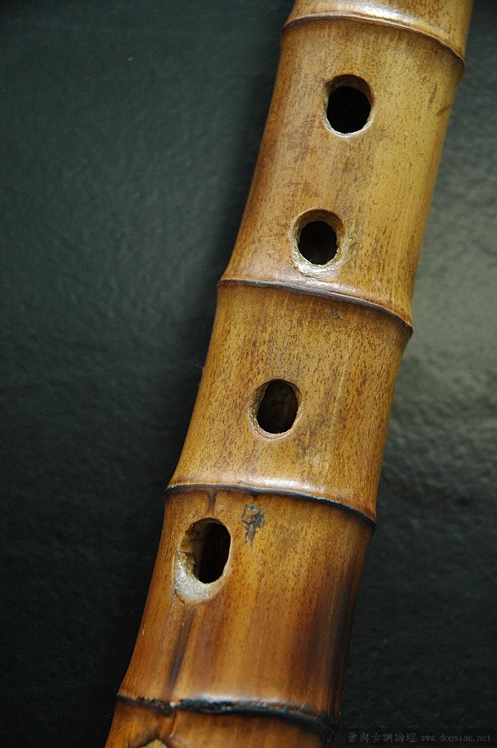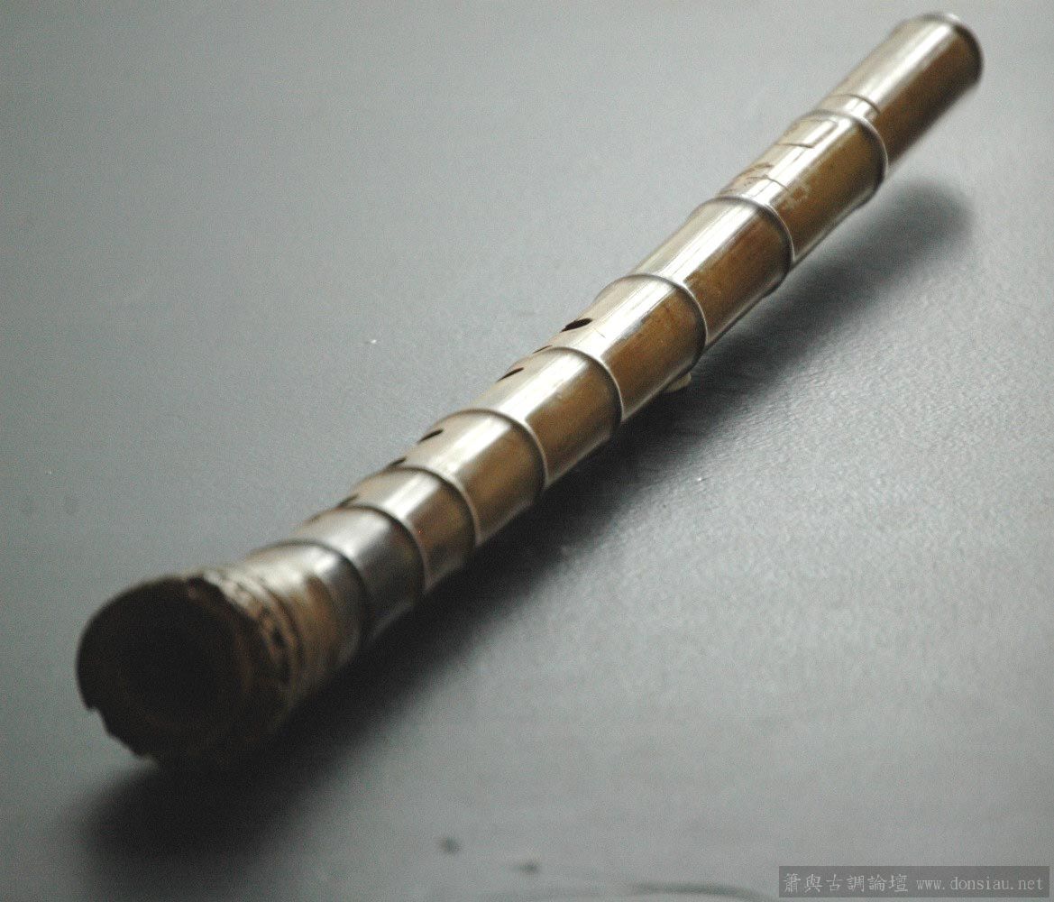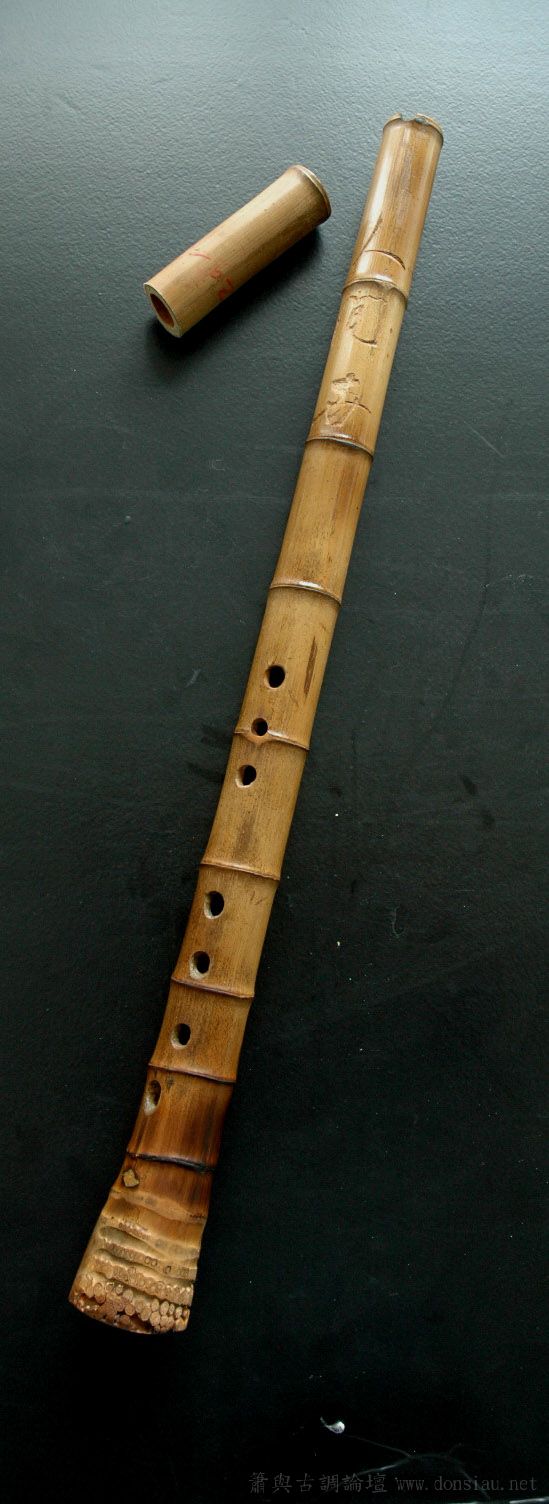 所用箫材微弯,形态十分美观,原来长度足够作E调,可惜最上一节有两道穿透竹壁、长5、6厘米的裂缝,无可奈何之下,惟有把这节锯掉,转作F调。