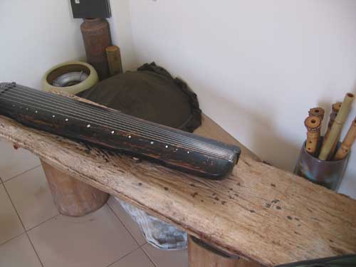 四結農場珍藏的蟲雕古樟木送我當琴桌.