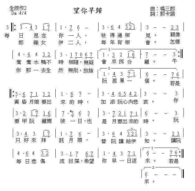 望你早歸曲譜