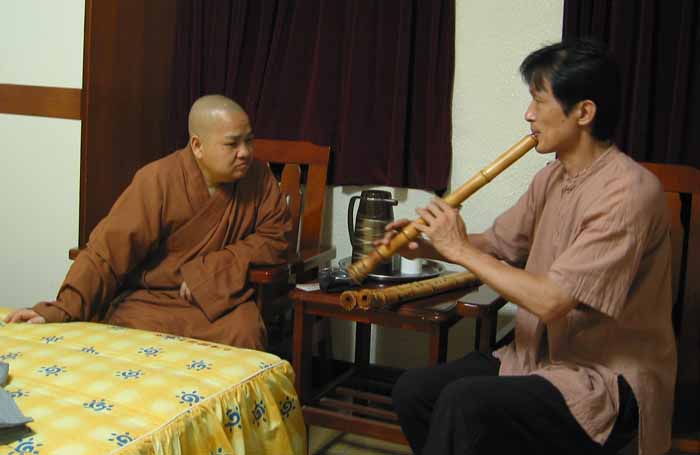 法師出生香港,由港簫友-粵曲專家陸老師介紹認識,法師出家前已對廣東樂與廣東南音有深厚基礎.聊起佛教的唱誦行腔,與粵曲唱法有雷同之處.不少佛教音樂都是古樂.
