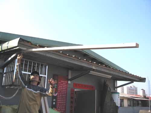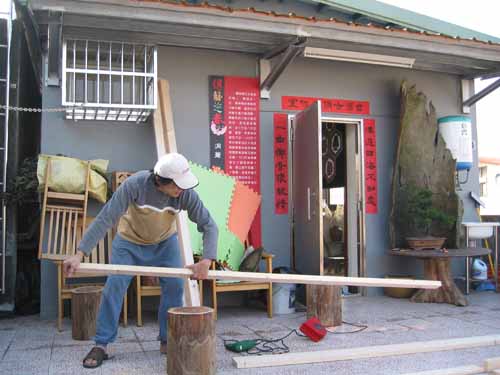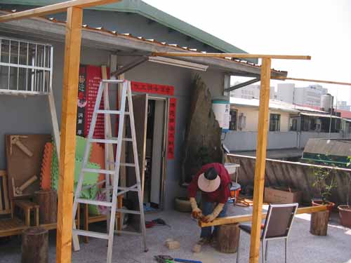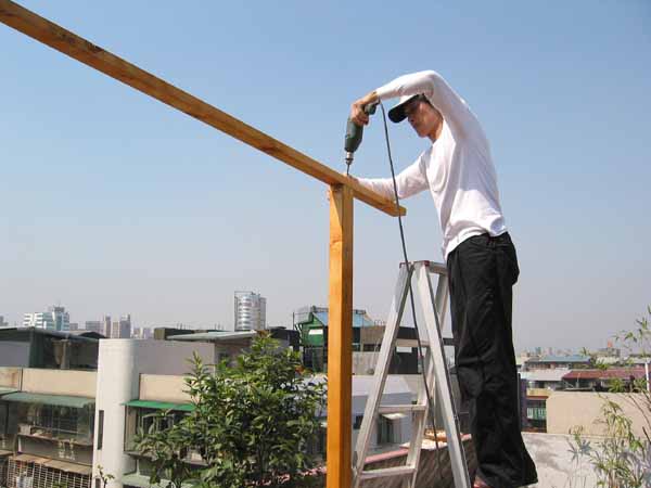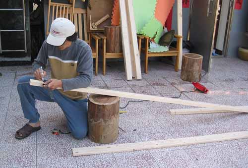 即將以杉木製作圍牆,準備半人高度牆面,以杉木組合起來。