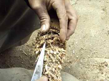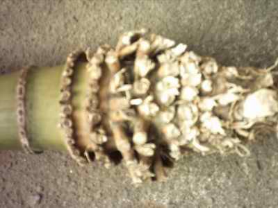 把長竹根修短方便挑根內土石,這是最艱難的工作,挑好洗淨。