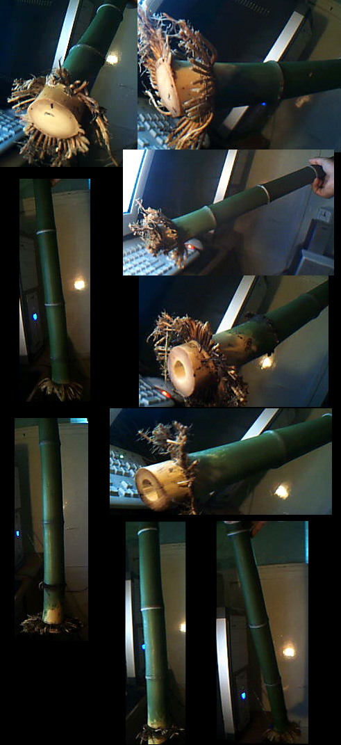 这种竹子一般的比较粗.竹节通常平均. 老,嫩的节头上全都有白边. 色碧绿无杂色. 根黄. 竹身笔直. 竹之间的根部有拇指粗的蛇状根相连接. 有时2-3根竹为一簇. 叶大小中等. 这3根是在林子里选出来的竹节比列合适的竹材.