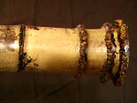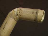 這支直徑約四公分的竹才,作成簫恐怕又要有人幫忙按孔,在實用性上覺得很難派上用場,因此構思如何能一人吹奏。有鑒於新竹簫友米先生做過彎管的經驗,思考彎管或加一小彎管吹嘴兩種方向,考慮到加小彎管吹嘴有如西洋樂器,不成簫了,乃決定彎曲處理。