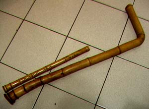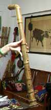 能一人吹奏的大簫,完成後覺得愛不釋手,一方面整體造型具有相當特色,尤其在彎曲段的決定,我採比較短的方式,整體造型維持洞簫的主體性,將進一步實驗更短彎管,甚至稍微在吹嘴轉向的三尺上下簫管,更豐富洞簫的音域範圍與實用價值。 完成於 2001/8/17清晨
