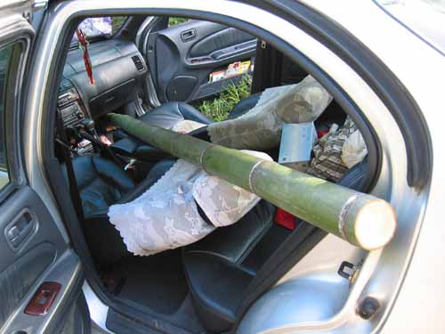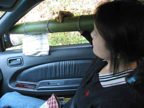 怎麼調整都無法完整上車,為留稍長的粗管比例,正好八尺八長度,不忍鋸短,乃留一段在車外,老婆一路扶著,慢慢載回。歸程中發現已飢腸轆轆!