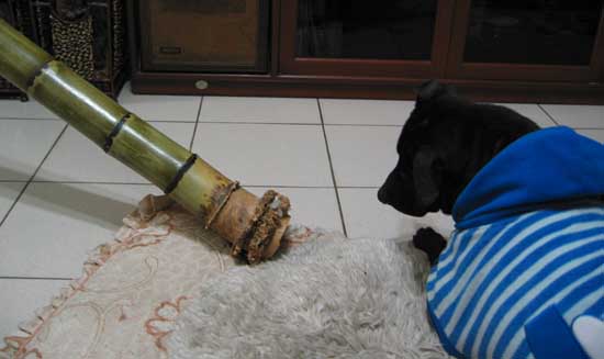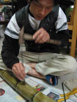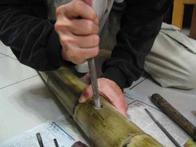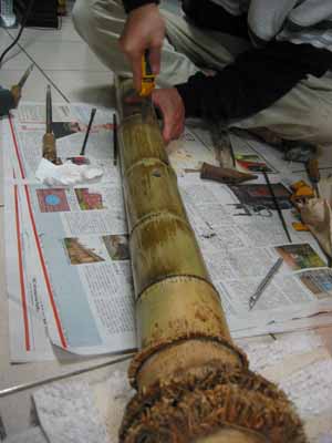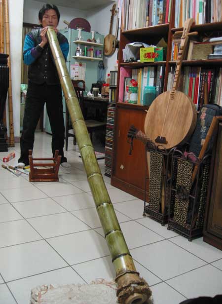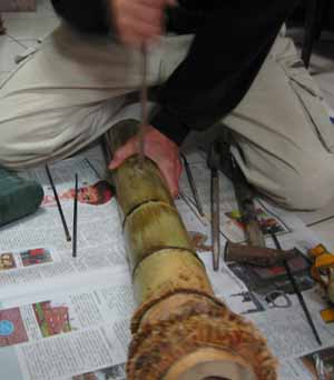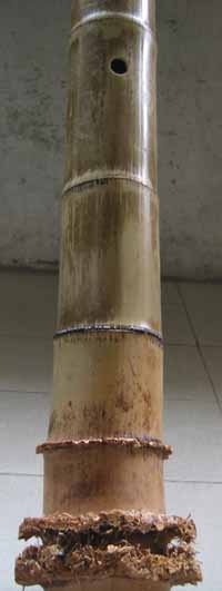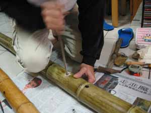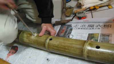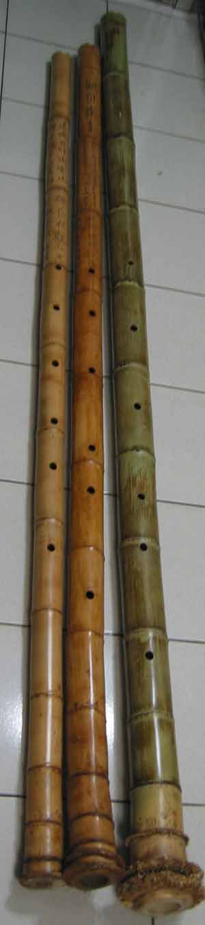筆者手製三把巨簫比較(左起七尺六DG,八尺CF,八尺八AD)